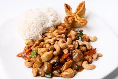 Stir-fried diced chicken and vegetables tossed with cashews in a soy, ginger and garlic sauce.