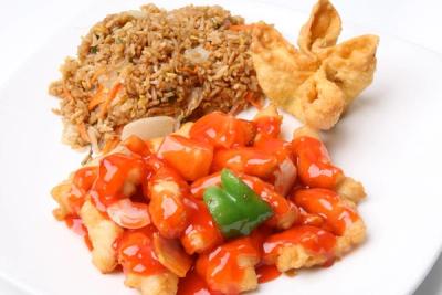 Battered-fried chicken with pineapple, green bell pepper and onion in a zesty sweet and sour sauce.