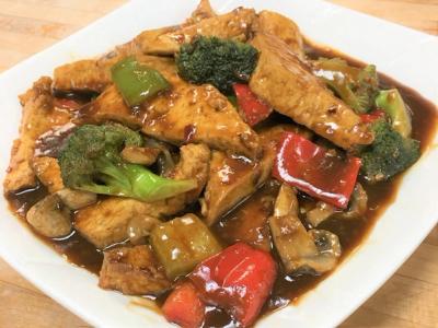 Tofu and mixed vegetables stir-fried in a spicy soy, ginger and garlic sauce.