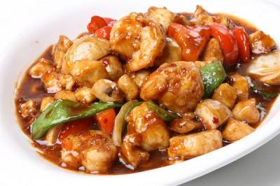 Stir-fried diced chicken and vegetables tossed with cashews in a soy, ginger and garlic sauce.