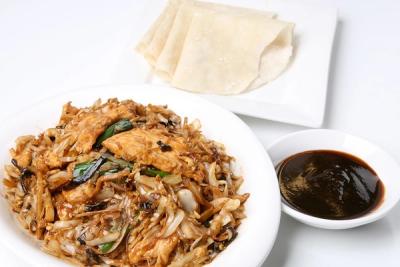One of our signature dishes! mixed vegetable stir-fried with cabbage, wood ear mushrooms, green onion, egg and vermicelli, Served with thin, homemade pancakes and hoisin sauce